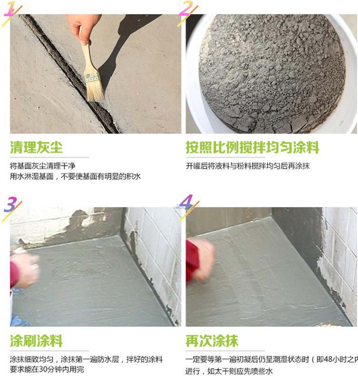 底層必須完全固化、完好、沒有灰塵,清除浮漿、油、油脂、脫膜劑及其它會(huì)影響防水效果