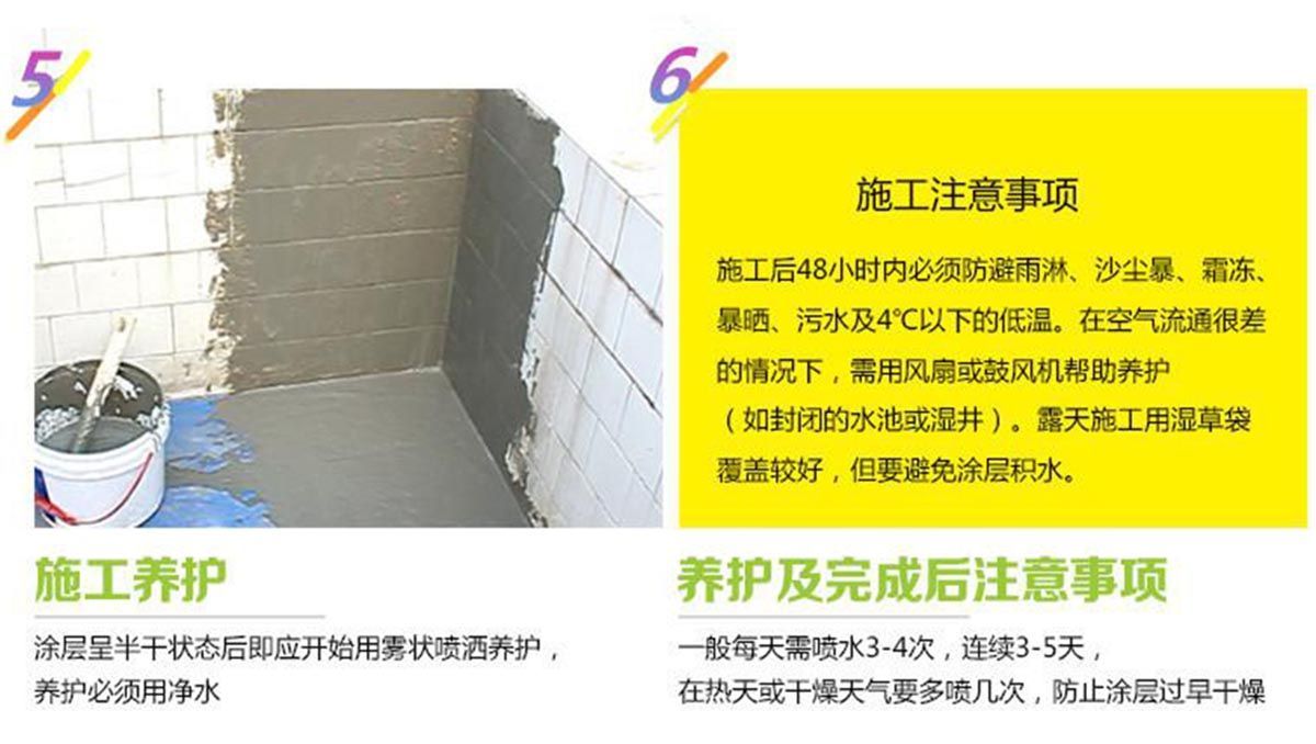 正確的固化對(duì)確保砂漿層的耐久性和質(zhì)量是非常重要的。為了防止涂層表面產(chǎn)生裂縫、粉化,防水涂料涂層應(yīng)保持潮濕,一旦施工后防水材料涂層開始固化即需開始養(yǎng)護(hù),用噴霧水對(duì)防水材料涂層進(jìn)行噴淋,一天需噴3~4次,如天熱,須增加噴淋的次數(shù)。施工后兩天內(nèi)必須防雨淋、風(fēng)沙、污水及霜凍。對(duì)于需要盛裝液體的混凝土構(gòu)件,在養(yǎng)護(hù)三天后,再放置二周的時(shí)間,方可使用。